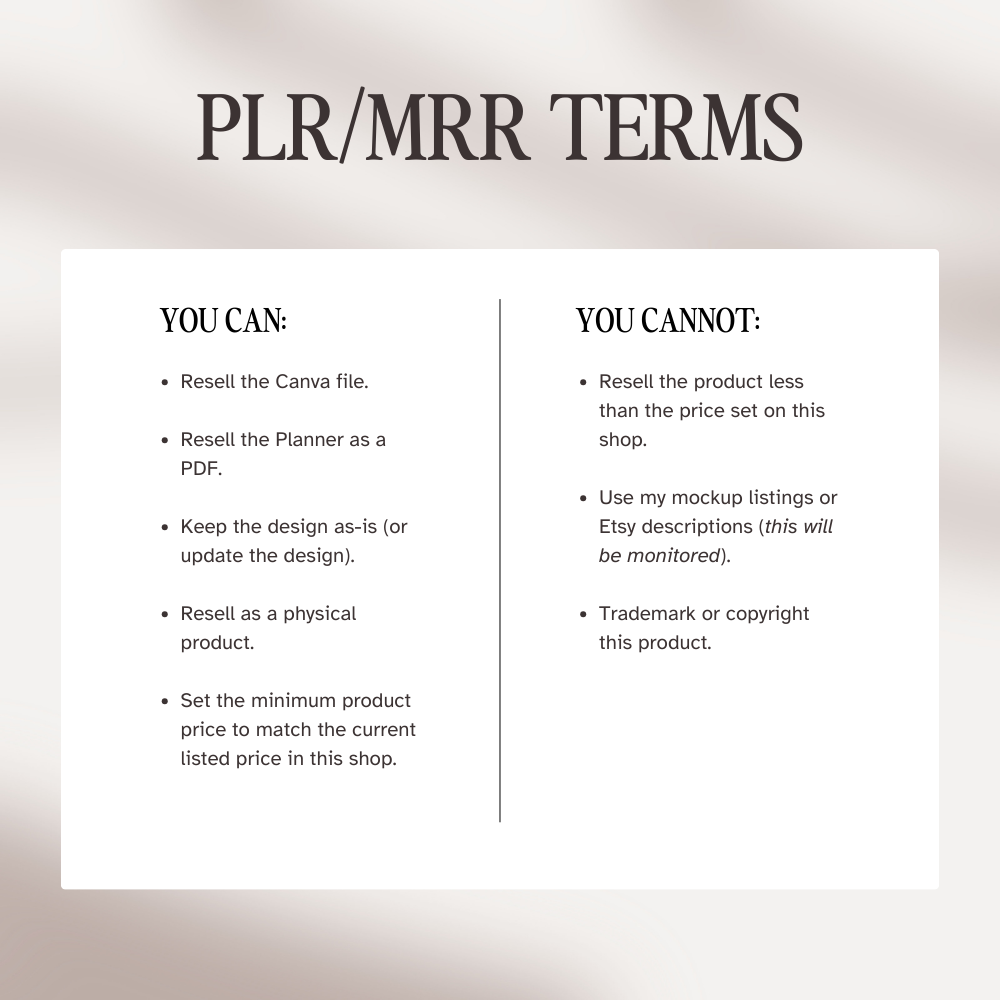 With PLR, you may edit and customize these Canva templates, and resell them as a flattened, non-editable PDFs for your customers’ personal use. You cannot share or resell the original Canva files.