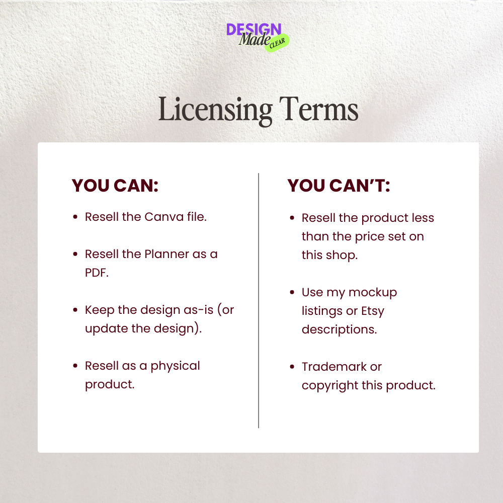 With PLR, you may edit and customize these Canva templates, and resell them as a flattened, non-editable PDFs for your customers’ personal use. You cannot share or resell the original Canva files.